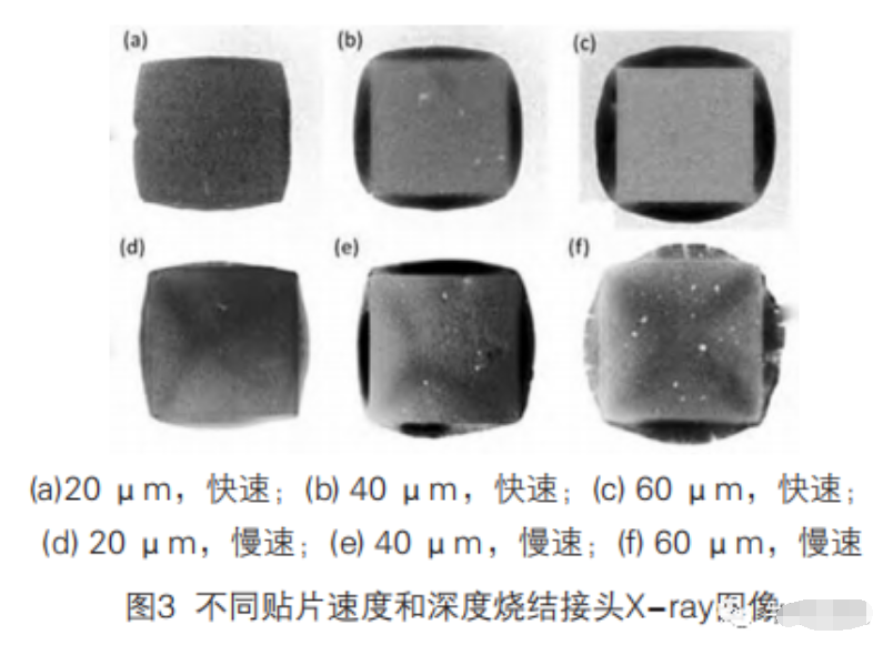 除了烧结时的工艺参数,贴片的工艺条件也会影响银烧结的连接质量。Takemasa等]使用不同的芯 片贴装速度和深度将Si芯片安装到印刷银浆料的Cu 基板后无压烧结,研究了芯片贴装速度和深度对银 烧结接头的影响。当贴片速度快时,银膏层均匀, 空洞较少,如图3(a)和图3(b)所示,但当贴片深度 达60 μm时,部分银膏被挤出,互连层残余银膏较 少,如图3(c)所示。当贴片速度较慢时,X-ray难以 穿过银密度较高的区域,芯片对角线上X-ray图像变 暗,呈现出深色的十字,如图3(d)~图3(f)所示。随着 贴片深度和空洞数量的增加,芯片周围的银膏体中 出现了许多裂纹。结果表明,更快的贴片速度和合 适的贴片深度有利于提高银烧结的连接质量。