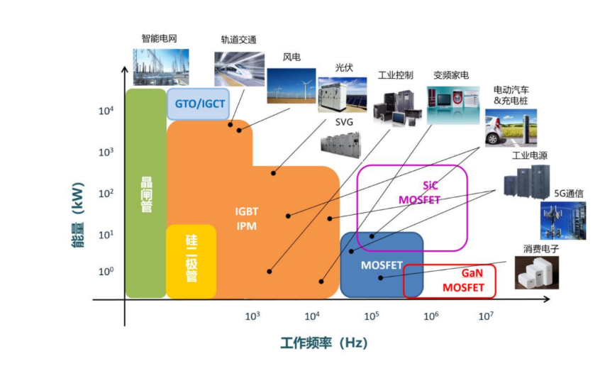 经过几十年的发展,硅正在达到其性能的极限,Si基器件性能提高的潜力愈来愈小。但新结构和新封装的引入升级仍推动着硅基器件的应用和市场发展。此外,以碳化硅为代表的宽禁带功率半导体器件凭借其优异的性能,逐步应用于高压、高频、高温和大功率电力电子领域。SiC被认为是一种超越 Si 极限的用于制造功率器件的材料。SiC功率器件面准的市场是大约600V以上的耐压用途,基于SiC衬底的IGBT器件甚至可达到20kV以上超高压。SiC功率器件可广泛应用于新能源汽车、5G 通讯、光伏发电、轨道交通、智能电网、航空航天等现代工业领域,特别是在新能源汽车领域的渗透逐步上升。