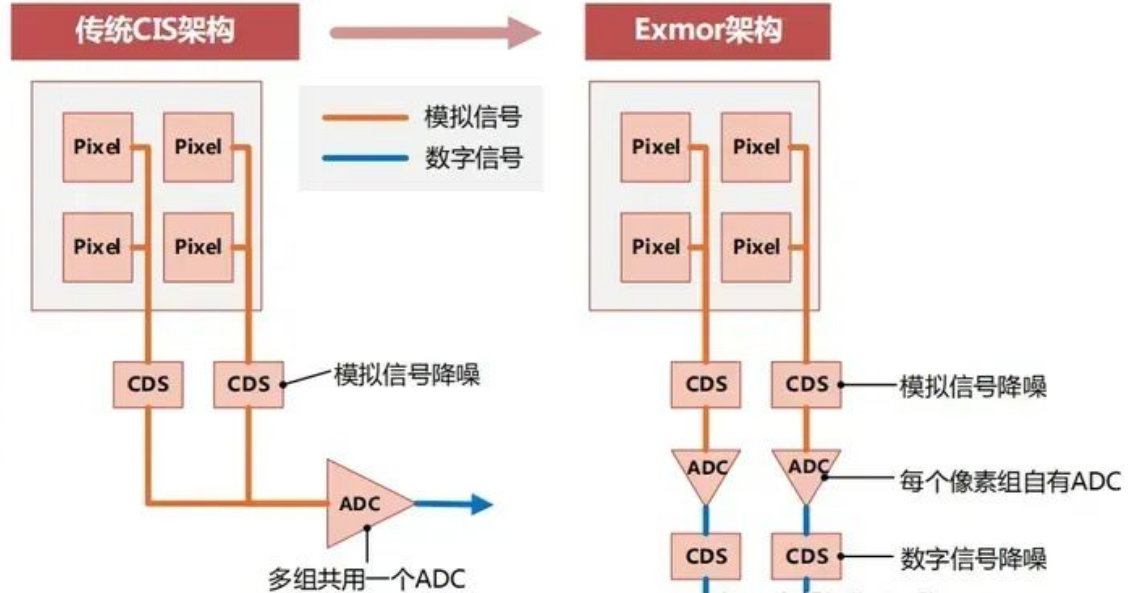索尼早于2007年chuan'gan发布了首款Exmor传感器。Exmor传感器在每列像素下方布有独立的ADC模数转换器,这意味着在CIS芯片上即可完成模数转换,有效减少了噪声,大大提高了读取速度,也简化了PCB设计。