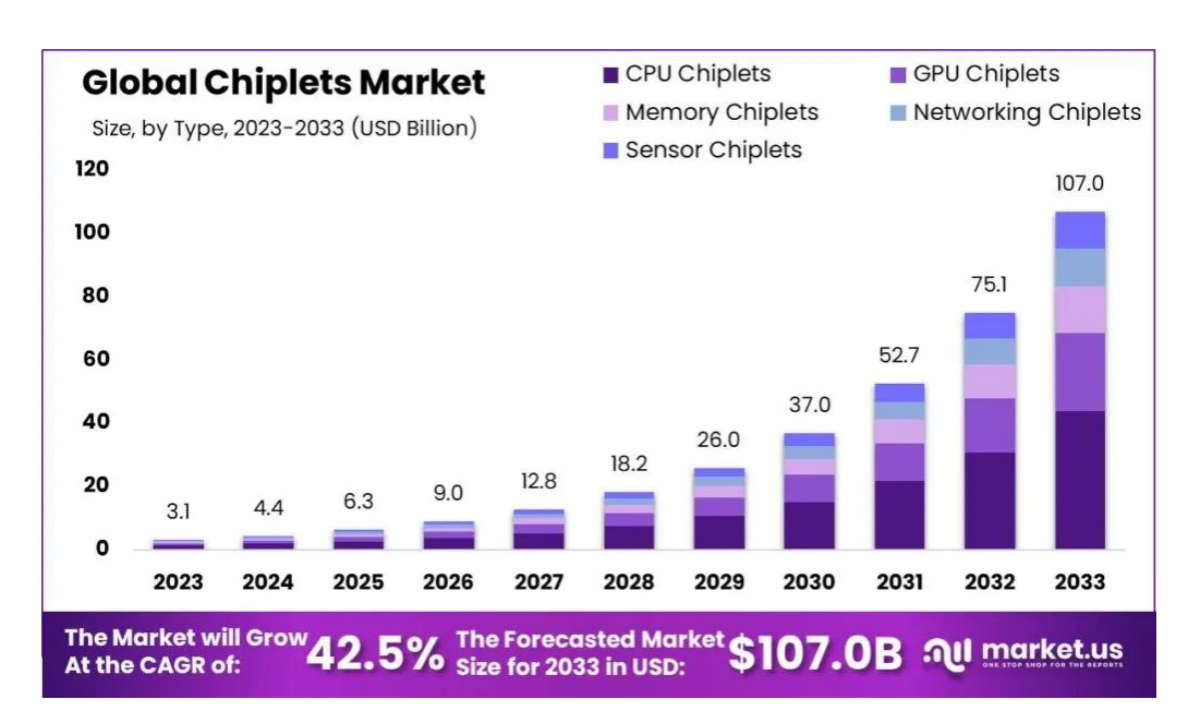 未来十年,Chiplet 市场预计将以42.5%的复合年增长率增长,到 2033 年估值将达到1070 亿美元。预计这一增长趋势将在 2024 年持续,估计价值将达到44 亿美元。