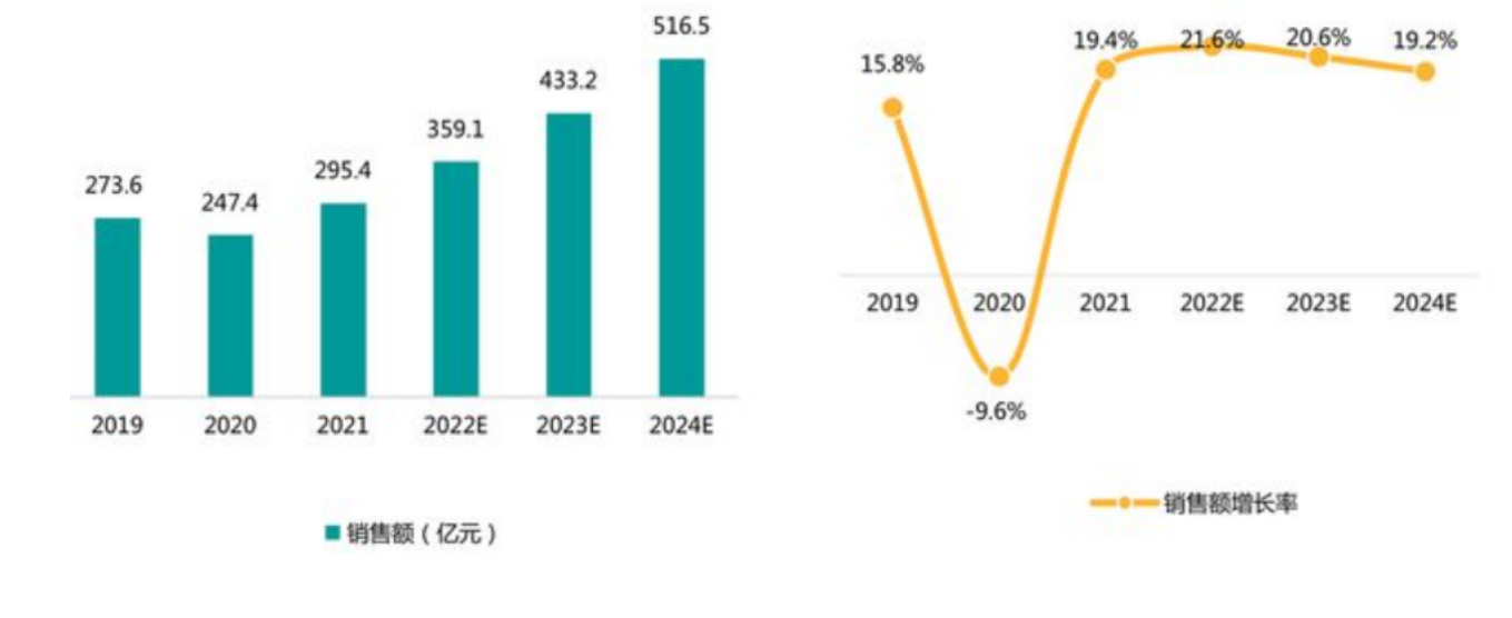 CMOS图像传感器在国内还处于高速发展的阶段,2021年国内CMOS图像传感器销售额为295.4亿元,同比增长19%,增速明显快于全球,预计到2024年国内CMOS图像传感器市场规模将达到516.5亿元,符合增长率为20%。